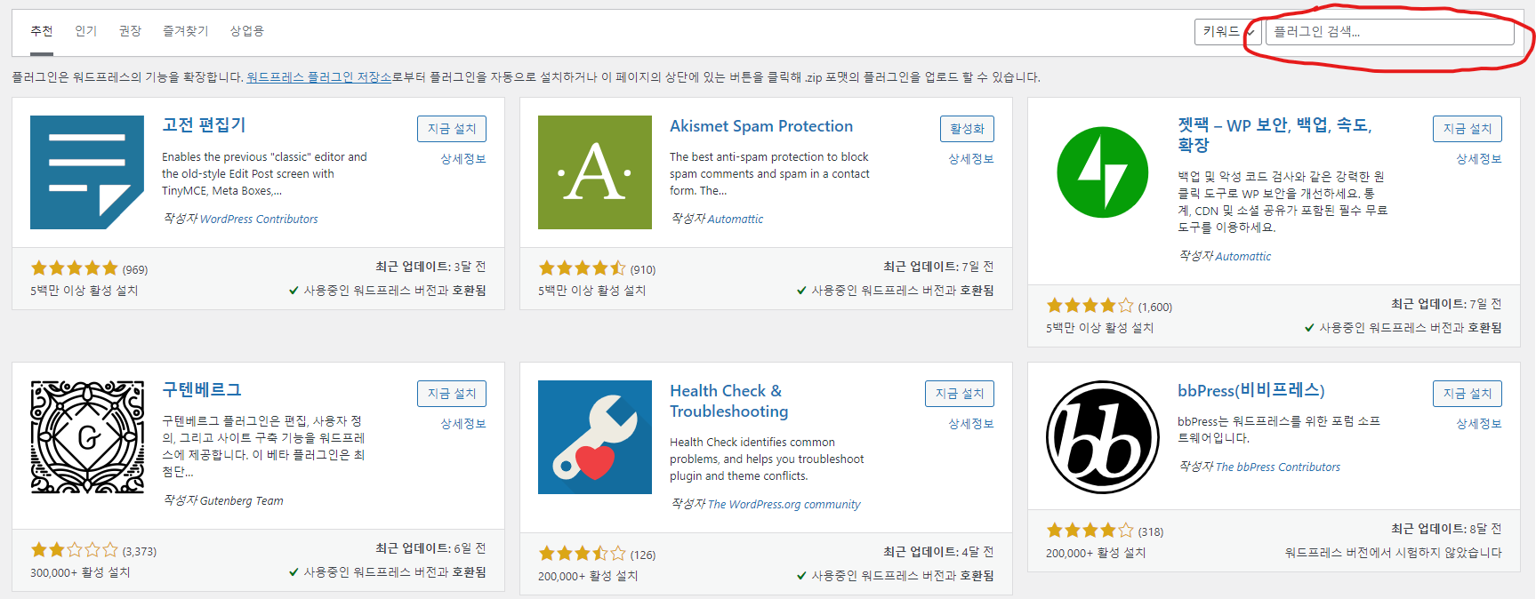 워드프레스에서 일반적으로 플러그인을 설치하기 위해서는