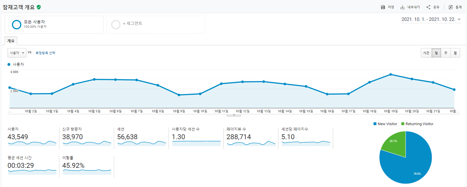 해당 기간 동안 총사용자가 43,549명, 신규 방문자가 38,970명이다. 대부분의 사용자가 홈페이지를 처음 사용한 것을 의미한다. 반대로 재방문자가 적다는 것을 의미하기도 하며, 사용자 수에서 신규 방문자 수를 뺀 값인 4,579명이 재 방문한 사용자 수가 된다.