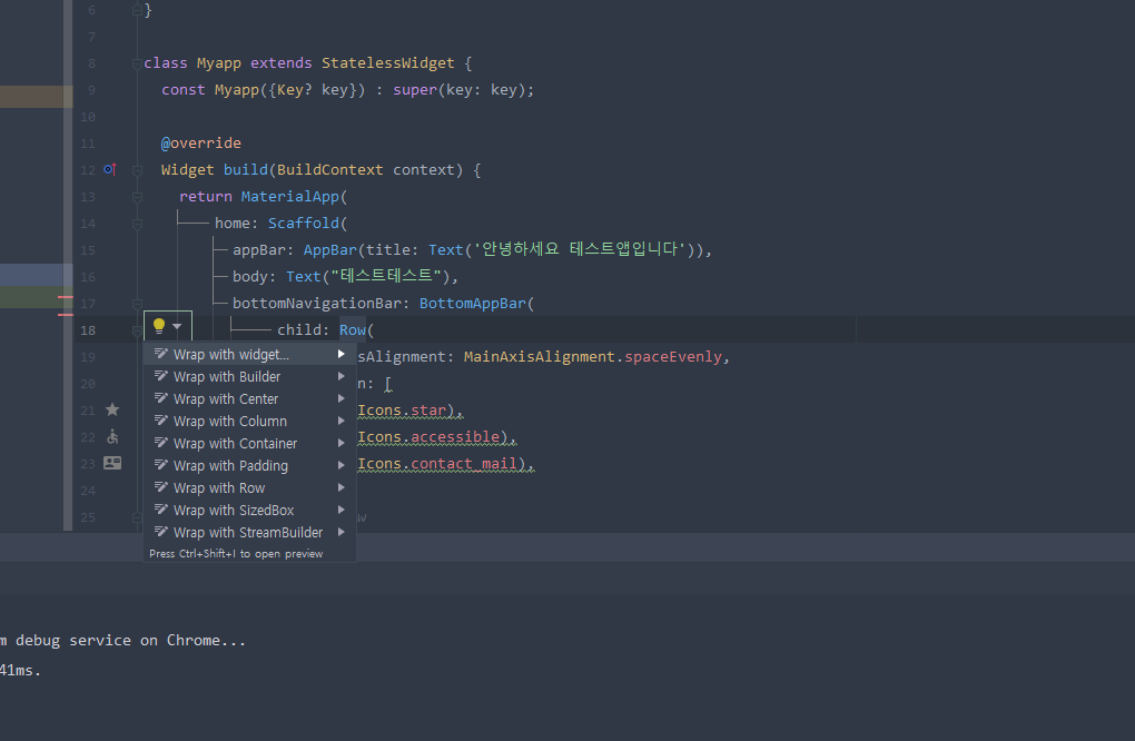 이런 경우 하단 영역의 높이가 너무 낮아서 비중을 조절해야 하는데 이런 경우 아이콘을 구성하고 있는 영역을 감싸고 있는 "BottomAppBar"의 하위 속성을 바꿔줘야 한다 하위 속성을 바꾸려면 "BottomAppBar"과 "Row"사이에 뭘 넣어줘서 바꿔야 하는데 이런경우 "Row"를 새로운 Container또는 SizedBox를 사용해서 감싸준다. Container의 경우 좀 무거운 경향이 있어서 우리가 필요한 기능인 height, Width만 쓴다면 SizedBox가 더 적합하다 그래서 가장 편하게 Row를 감싸는 SizedBox를 생성하는 방법은 다음과 같다